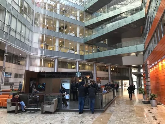 При входе в бизнес-центр расположен просторный светлый атриум с водной стеной и панорамной крышей, создающей ощущение воздушности пространства. В центре атриума - лобби-бар, удобный для встречи гостей и деловых переговоров. Здесь также располагаются торговая галерея и рестораны.