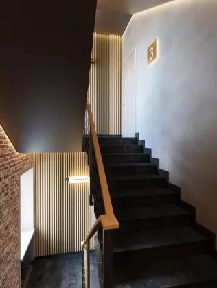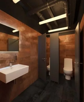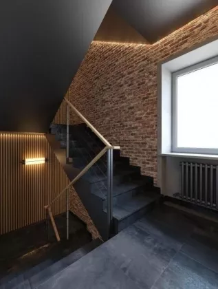 Отделка офисных помещений - Пол: наливной пол ЕСП-Полимер (Россия) - Стены: тонированная кирпичная кладка / гипсокартон - Потолок: покраска в черный цвет ж/б плиты, металлических балок и инженерных коммуникаций Отделка общественных помещений - Пол: керамогранит Italon (Россия) - Стены: тонированная кирпичная кладка / деревянные декоративные панели / керамогранит Italon (Россия) - Потолок: покраска в черный цвет ж/б плиты, металлических балок и инженерных коммуникаций / гипсокартон